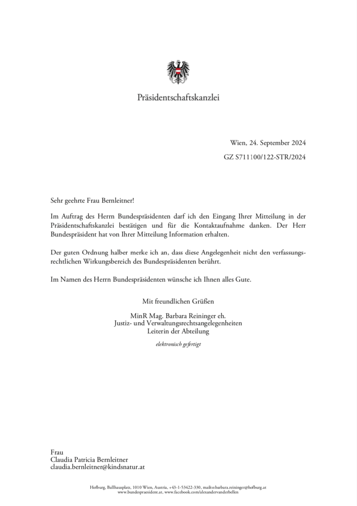 Angesprochen auf die schweren Menschenrechtsverletzungen wurde mir über die Präsidentschaftskanzlei im Auftrag von Dr. Alexander Van der Bellen am 24.9.2024 mitgeteilt, „dass diese Angelegenheit nicht den verfassungsrechtlichen Wirkungsbereich des Bundespräsidenten berührt.“, was rechtlich „leider“ absolut nicht korrekt ist, weil: