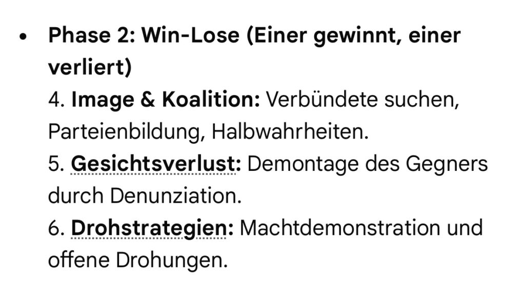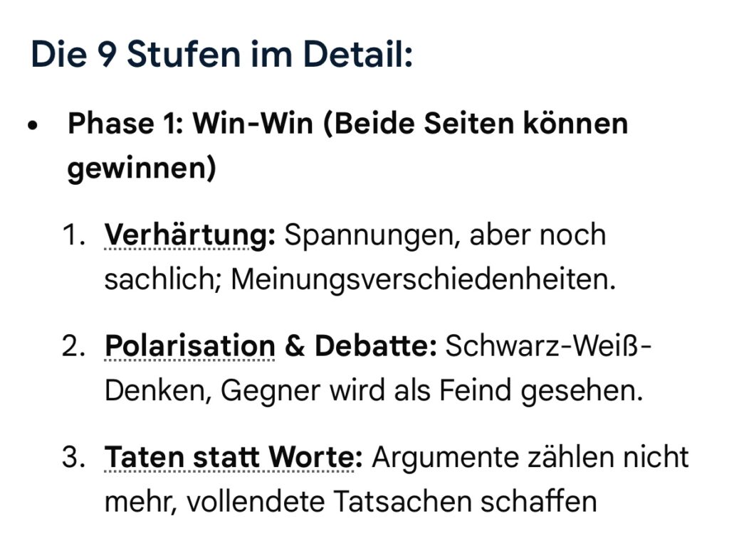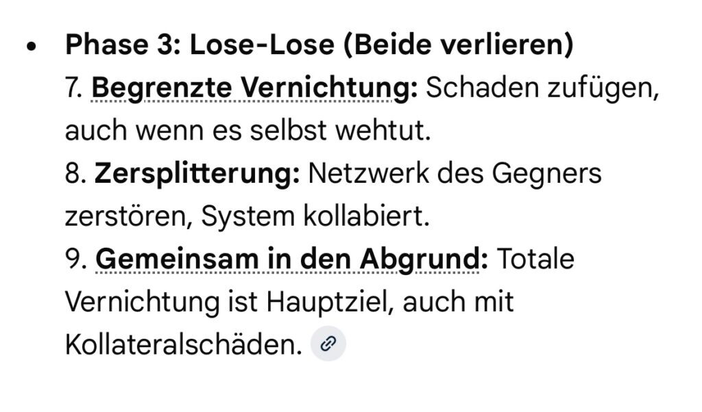Ab Stufe 7 (Begrenzte Vernichtung – Konflikteskalationsstufen nach Dr. Friedrich Glasl) kann ein Konflikt nur durch eine Intervention durch Dritte bzw. einen Machteingriff von außen einer Lösung zugeführt werden. Wir befinden uns in Phase 3 (Lose – Lose) Stufe 8 (Zersplitterung) bis 9 (Gemeinsam in den Abgrund).